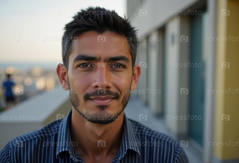 В момент спокойствия молодой человек уверенно стоит на фоне городской архитектуры, запечатлевая теплый дух Газы. Его выражение излучает надежду и стойкость