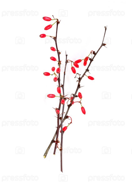 Колючая ветка куста барбариса с красными ягодами, изолированная на белом фоне