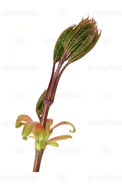 Ветка растения с почками и маленькими листьями, изолированная на белом фоне