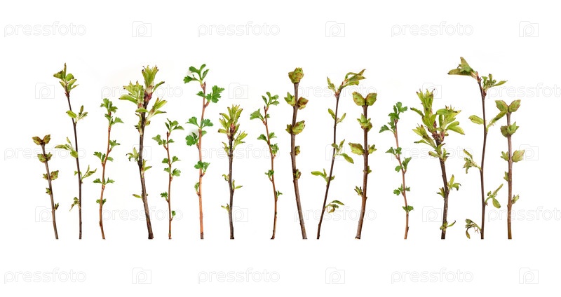 Ветки растений с почками и маленькими листьями, изолированные на белом фоне