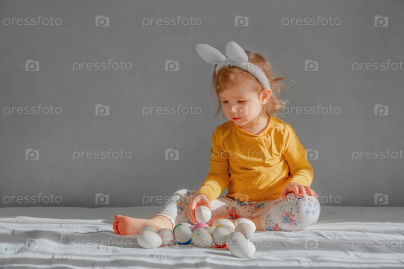 Милый ребенок в ушках кролика сидит и смотрит на пасхальные яйца