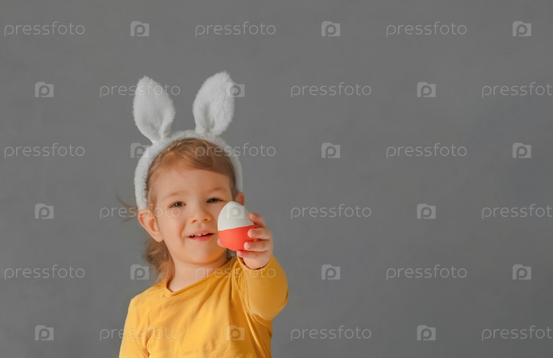 Крупным планом портрет милого ребенка в ушках кролика, держащего пасхальные яйца