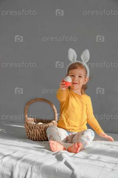 Милый ребенок в ушках кролика сидит рядом с корзиной и протягивает пасхальное яйцо