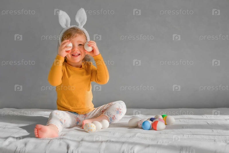 Милая маленькая девочка в ушках кролика на голове держит пасхальные яйца в руках. Веселый улыбающийся счастливый ребенок. Пасха