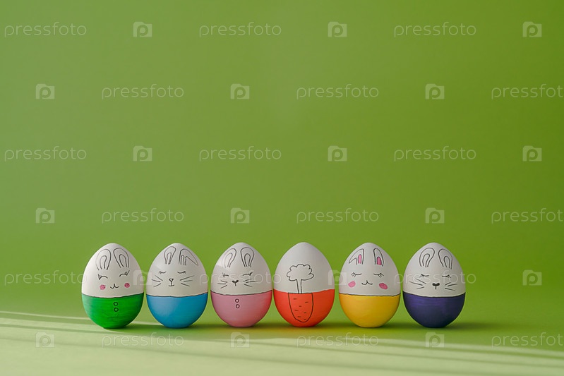 Композиция с пасхальными яйцами на зеленом фоне. Пасхальные яйца стоят в ряд и покрыты наполовину окрашенными в зеленый, синий, розовый, оранжевый, желтый, фиолетовый цвета с милыми изображениями кроликов и морковки