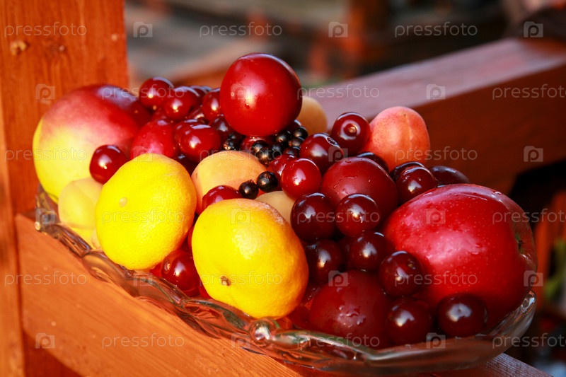 Красочная композиция свежих фруктов, включая яблоки, черешню, сливы и абрикосы, мандарины аккуратно уложенные в стеклянную вазу на деревянной террасе