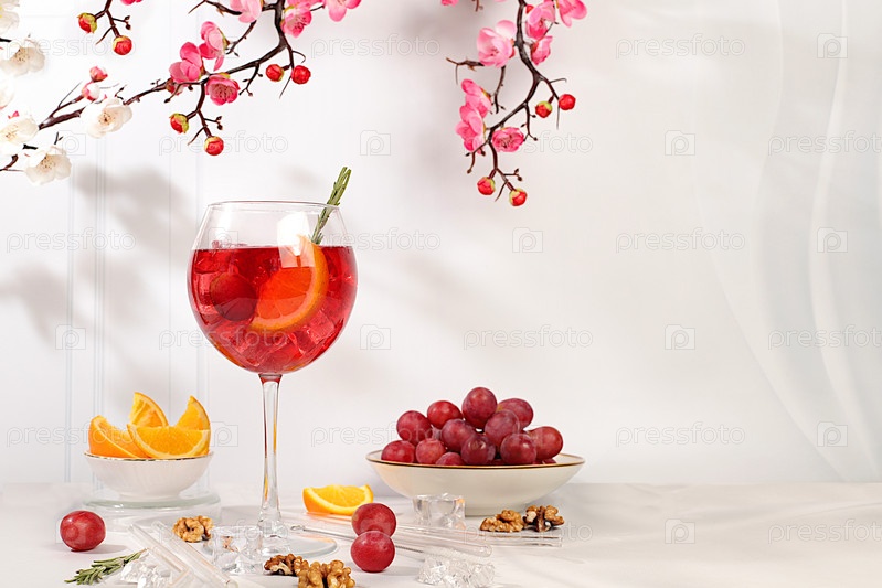 Королевский лимонадный коктейль с текилой, джином, ромом, льдом и виноградом, концепция бара и вечеринки, рекламная карточка ресторана и кафе, элегантный минимальный фон, выборочный фокус