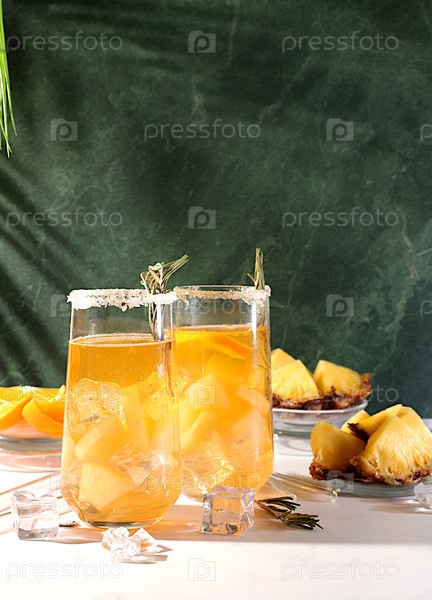 Концепция летней вечеринки. Коктейль из текилы, рома и водки с дольками ананаса, апельсина, льда и розмарина. Диетический напиток для детоксикации и снижения веса, реклама бара или кафе, меню ресторана