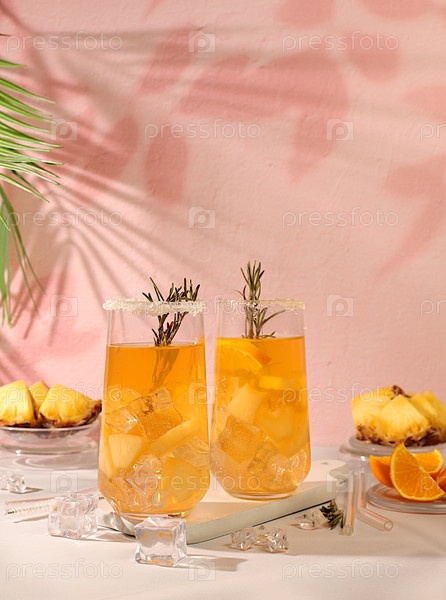Коктейль из текилы, рома и водки с ломтиками ананаса, апельсина, льда и розмарина. Концепция летней вечеринки. Диетический напиток для детоксикации и снижения веса, реклама бара или кафе, меню ресторана