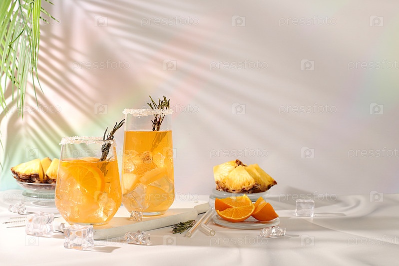 Коктейль из текилы, рома и водки с ломтиками ананаса, апельсина, льда и розмарина. Концепция летней вечеринки. Диетический напиток для детоксикации и снижения веса, реклама бара или кафе, меню ресторана
