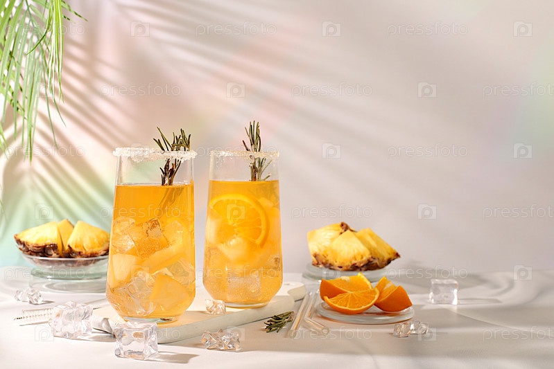 Концепция летней вечеринки. Коктейль из текилы, рома и водки с дольками ананаса, апельсина, льда и розмарина. Диетический напиток для детоксикации и снижения веса, реклама бара или кафе, меню ресторана