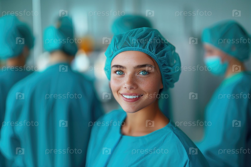 Портрет счастливой молодой женщины-медика в хирургическом костюме в операционной