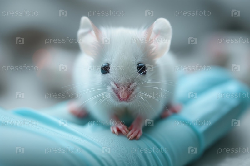 Белая мышь в руках человека в защитных латексных перчатках на размытом фоне, крупный план