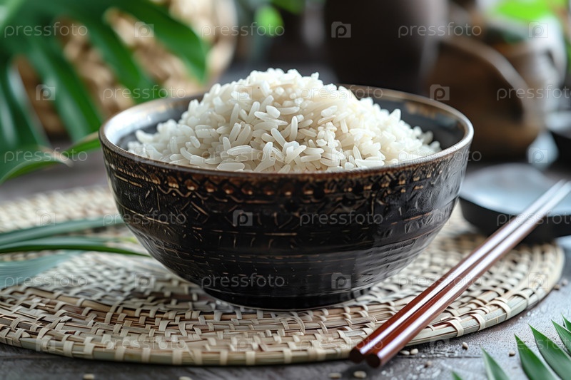 Миска с вкусным вареным рисом на столе, крупным планом. Азиатская кухня