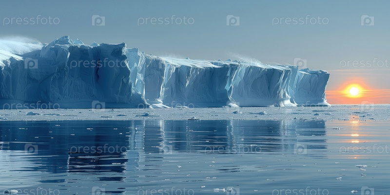 Побережье Антарктиды, крутой край шельфового ледника в море на фоне низкого солнца