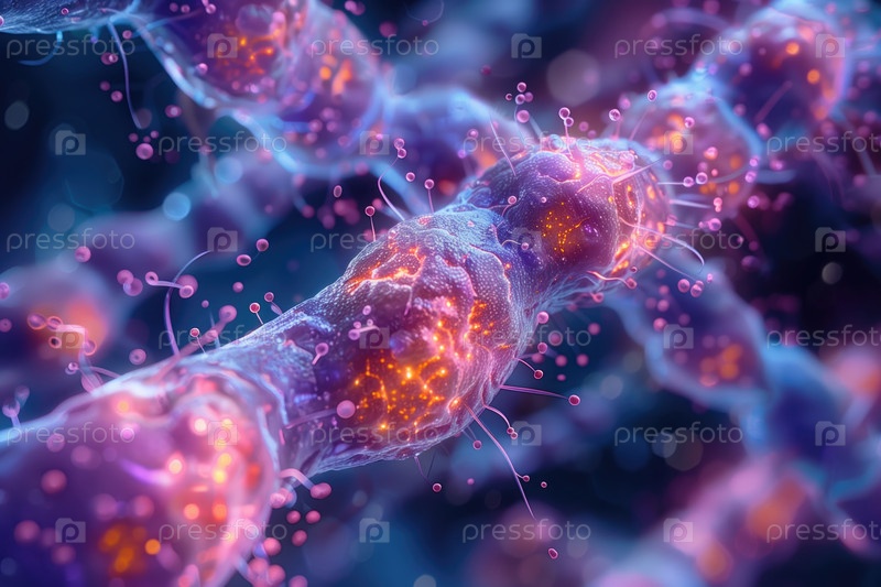 Объемная цветная иллюстрация красочных микроскопических биогенных структур, фон на тему генетики, микробиологии, биохимии