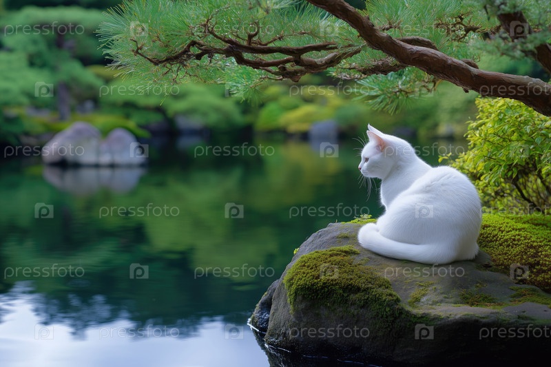 Белый кот сидит на камне в японском саду и отражается в воде