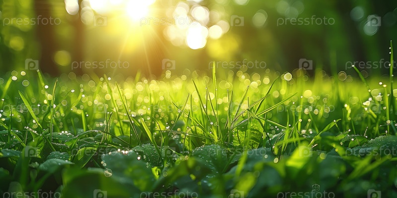 Свежая зеленая трава с капельками росы и солнечным светом