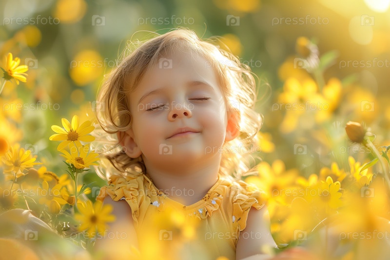Adorable little girl in yellow flower field on sunny summer day. ребенок