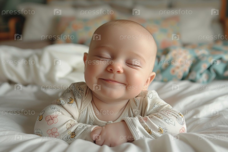 Портрет счастливого, милого, улыбающегося новорожденного ребенка на кровати
