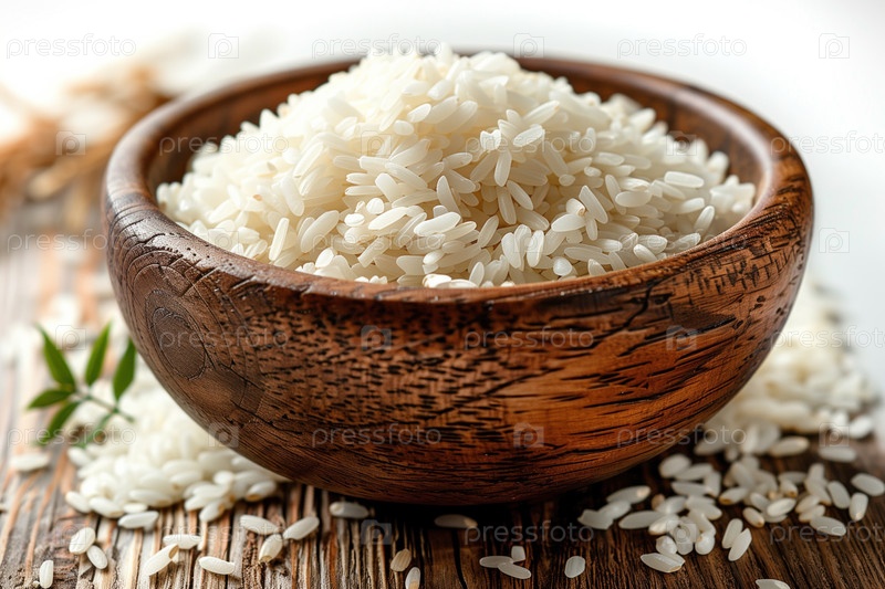 Деревянная миска с вареным рисом на столе, крупным планом. Азиатская кухня