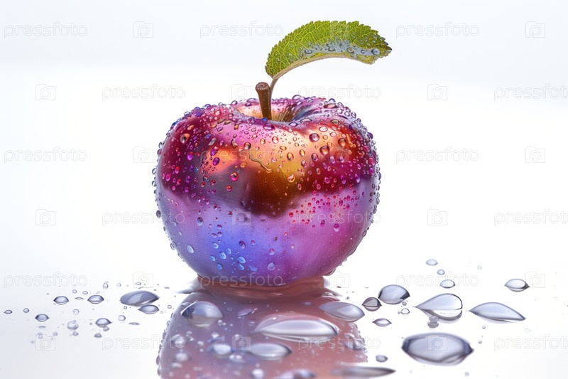 Фиолетовое яблоко с металлическим оттенком кожицы, покрытой каплями воды на белом фоне