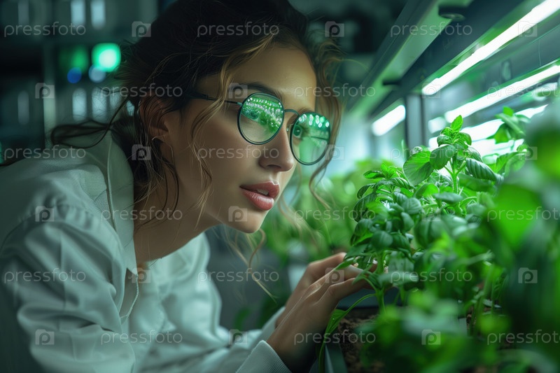 Красивая молодая женщина-ученый работает в лаборатории. Она изучает растения