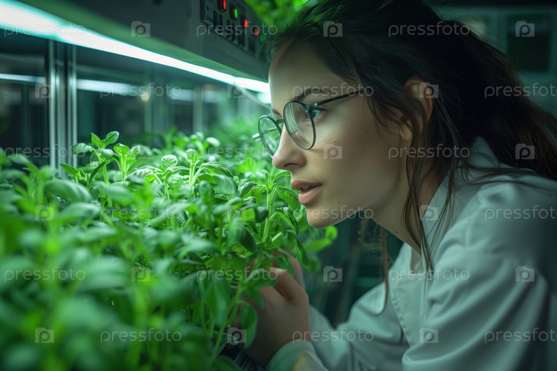 Молодая женщина-ученый работает в теплице. Она изучает растения