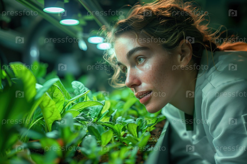 Молодая женщина-ученый работает в теплице. Биотехнология, биохимия, генетика и концепция медицины