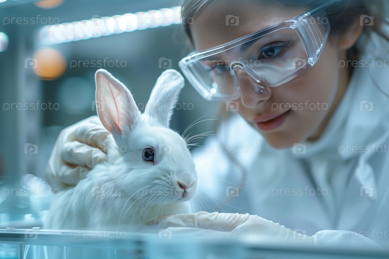 Ученый проводит эксперимент с белым кроликом в лаборатории