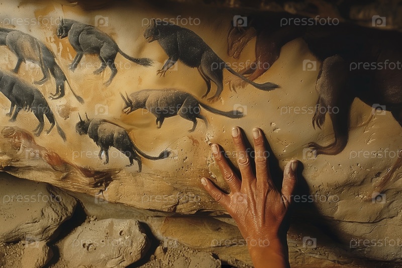 Наскальная живопись, рука коренного жителя касается древнего камня с изображенными на нем загадочными существами