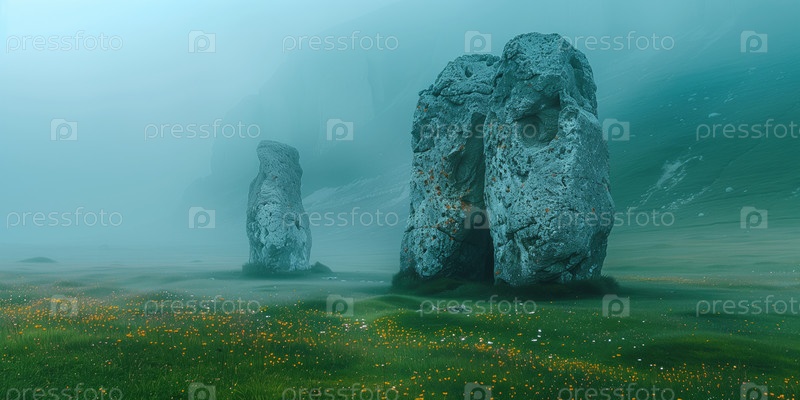Древние мегалитические камни туманным утром на лугу в горной долине