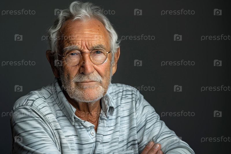 Портрет улыбающегося пожилого мужчины в очках на размытом фоне