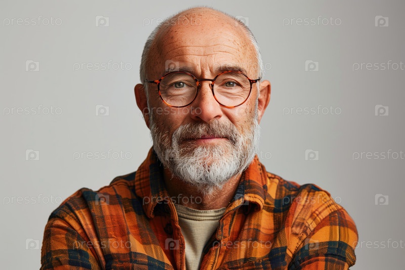 Портрет улыбающегося пожилого мужчины в очках на сплошном сером фоне