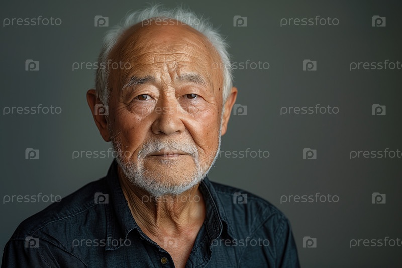 Портрет азиатского пожилого мужчины на сплошном сером фоне