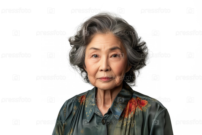 Портрет пожилой азиатской женщины на сплошном сером фоне