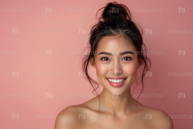 Портрет красивой молодой азиатской женщины на розовом фоне