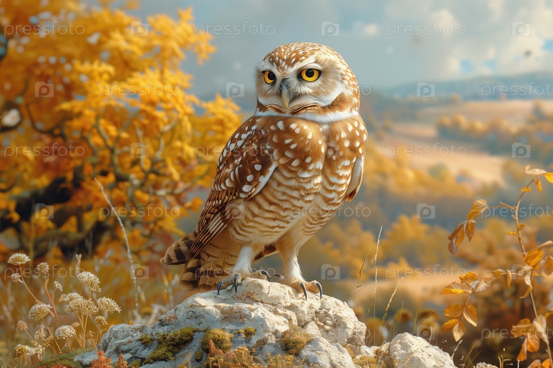 Маленькая сова (Athene noctua) сидит на камне в осеннем лесу