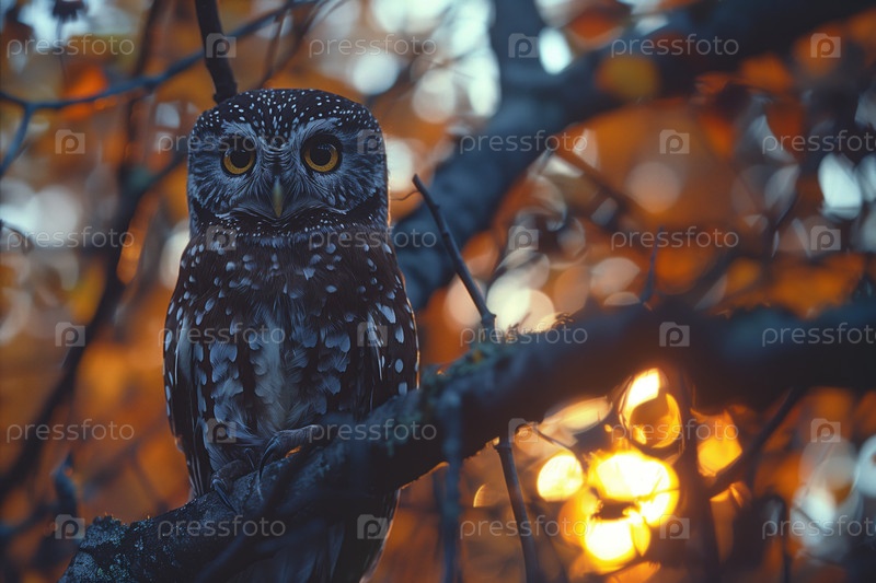 Красивая сова сидит на ветке дерева в осеннем лесу
