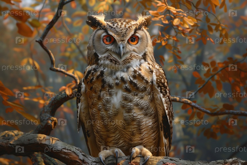 Большая рогатая сова (Bubo virginianus) в осеннем лесу