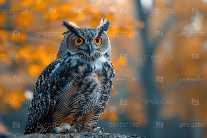 Филин (Bubo bubo) сидит на ветке в осеннем лесу. Красивая сова