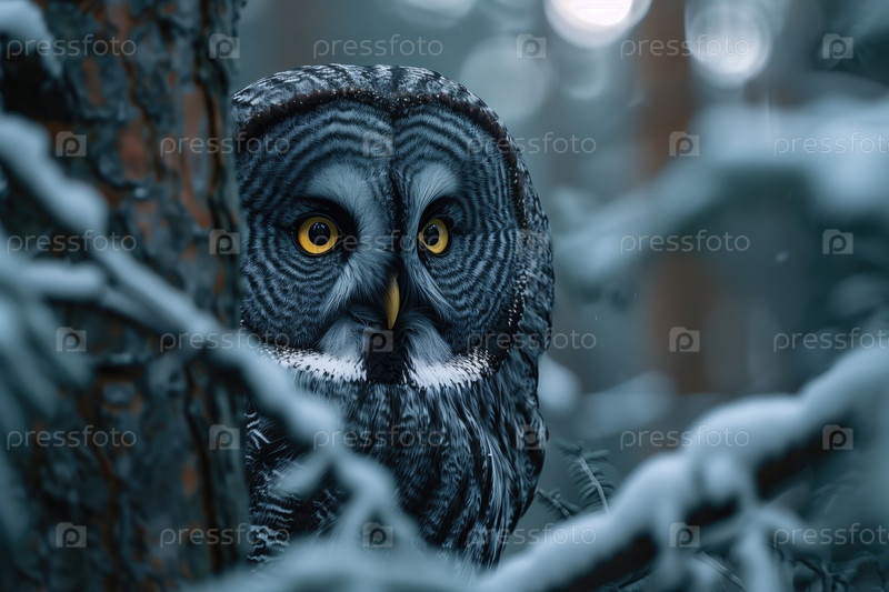 Неясыть серая (Strix nebulosa) в зимнем лесу ночью