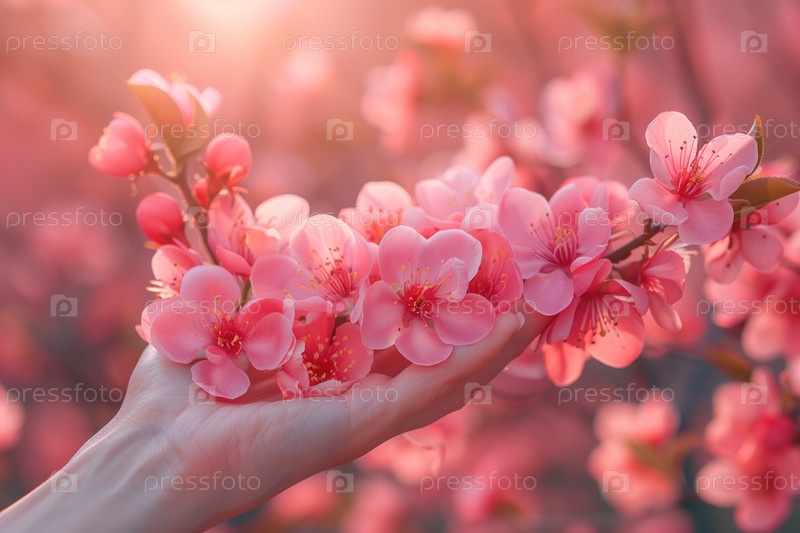 Цветущая вишня в женской руке, крупный план красивых розовых цветов на размытом цветочном фоне