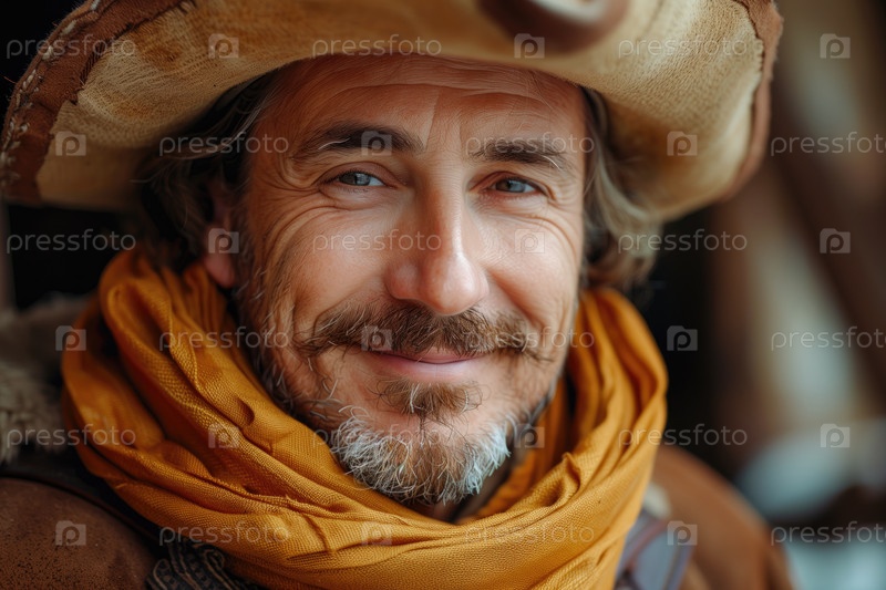 Портрет крупным планом красивого зрелого мужчины в шляпе и шарфе