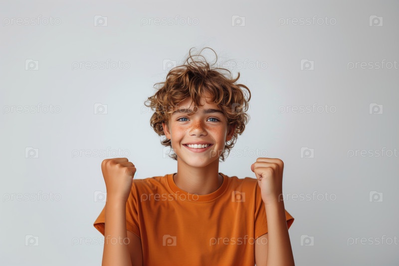 Веселый мальчик в оранжевой футболке радуется на белом фоне