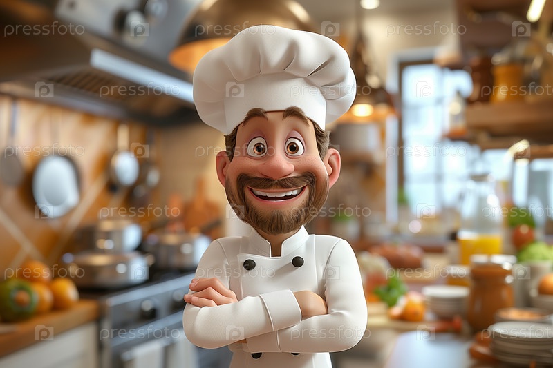 Мультяшный шеф-повар с забавным лицом на кухне. Концепция еды и кухни