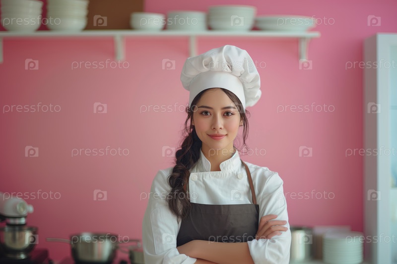 Портрет молодой азиатской женщины в поварском колпаке и фартуке, стоящей со скрещенными руками на кухне