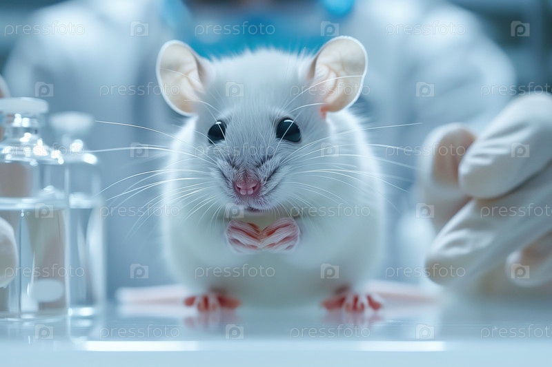Крупный план белой лабораторной крысы рядом с лабораторной посудой