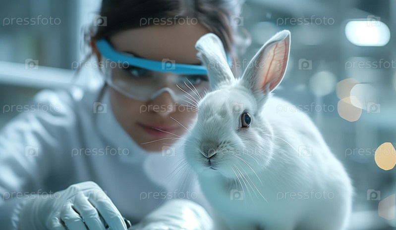Исследователь проводит эксперименты на белом кролике в лаборатории