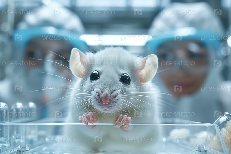Белая лабораторная крыса на фоне научной группы, работающей в лаборатории